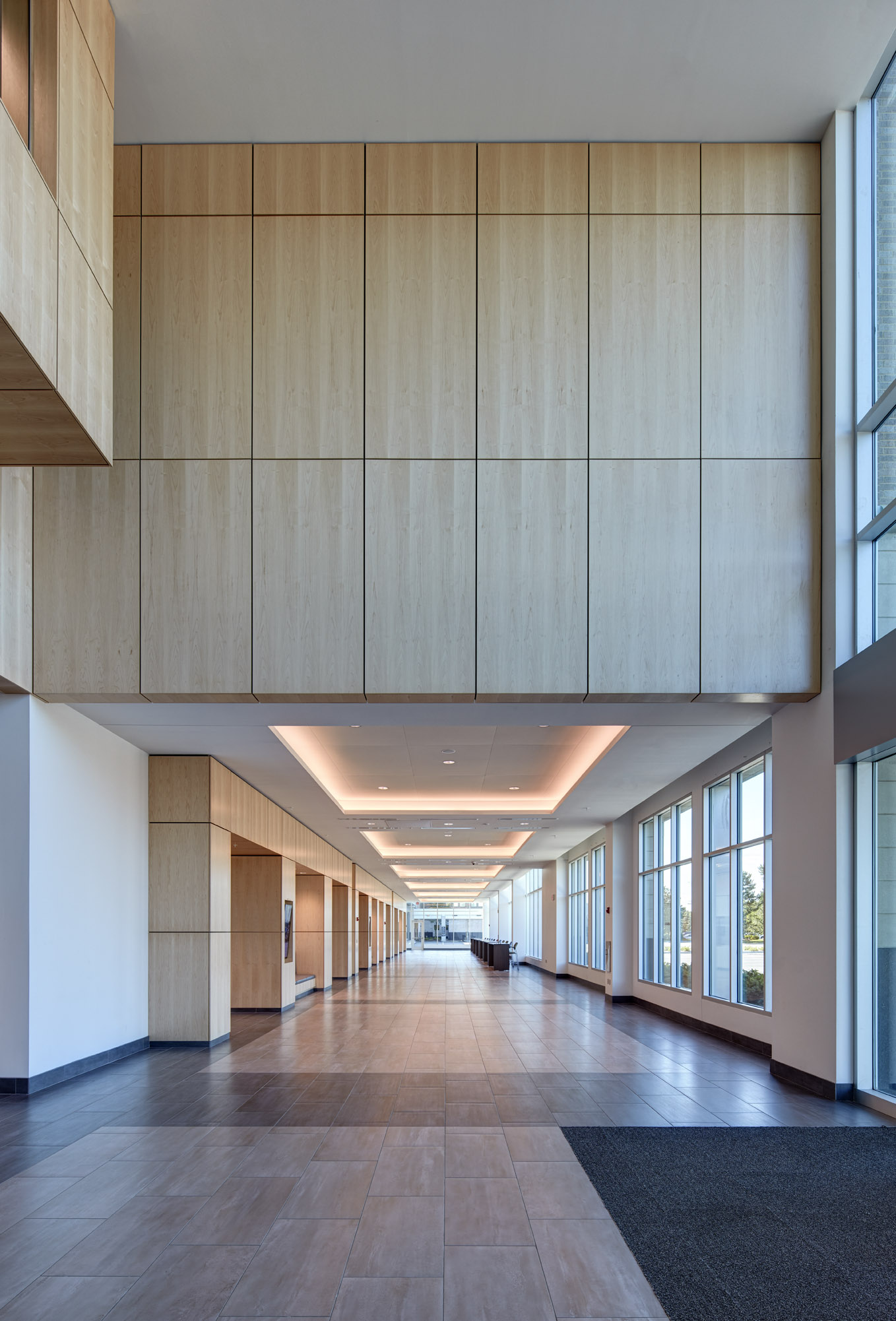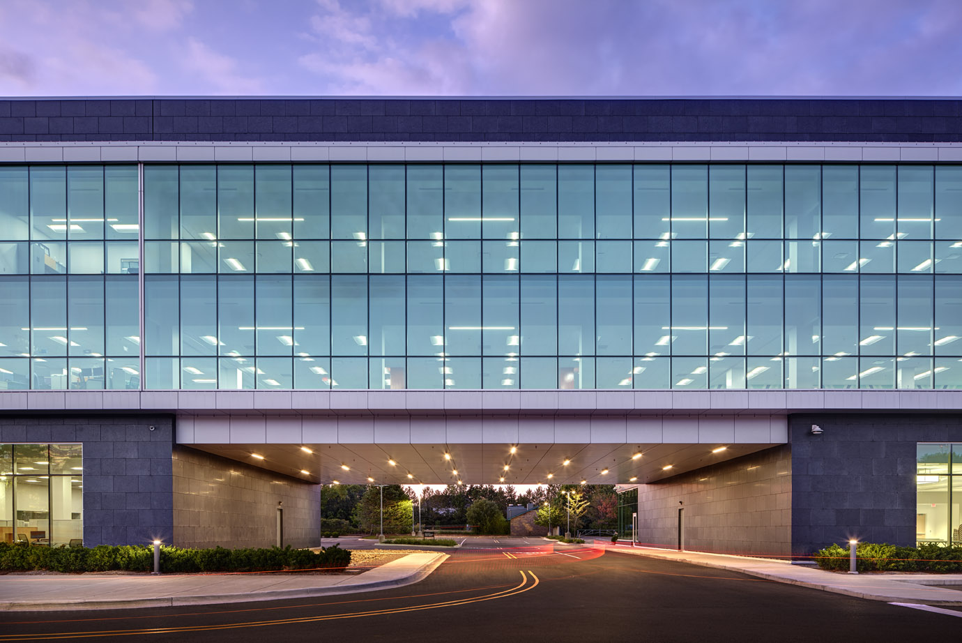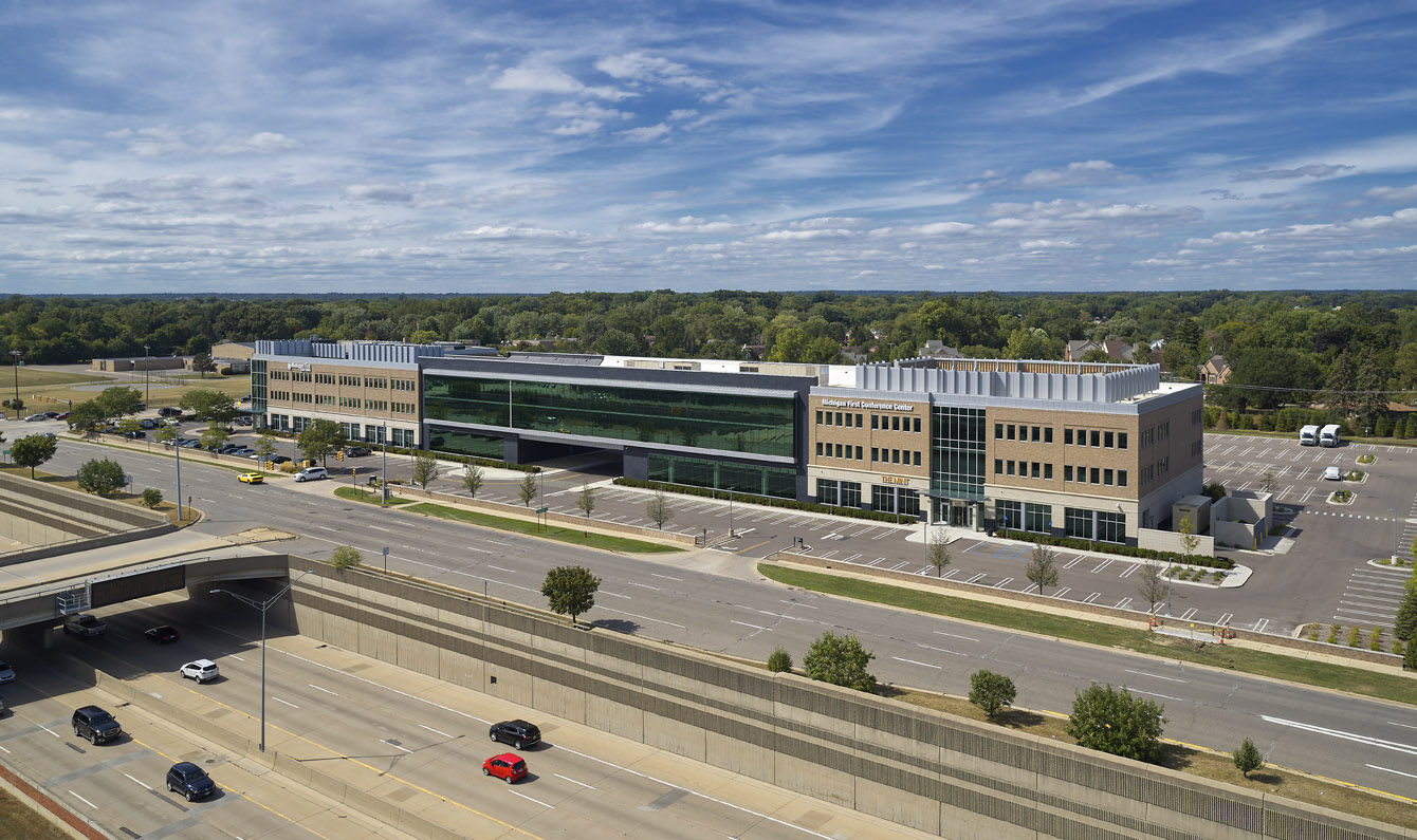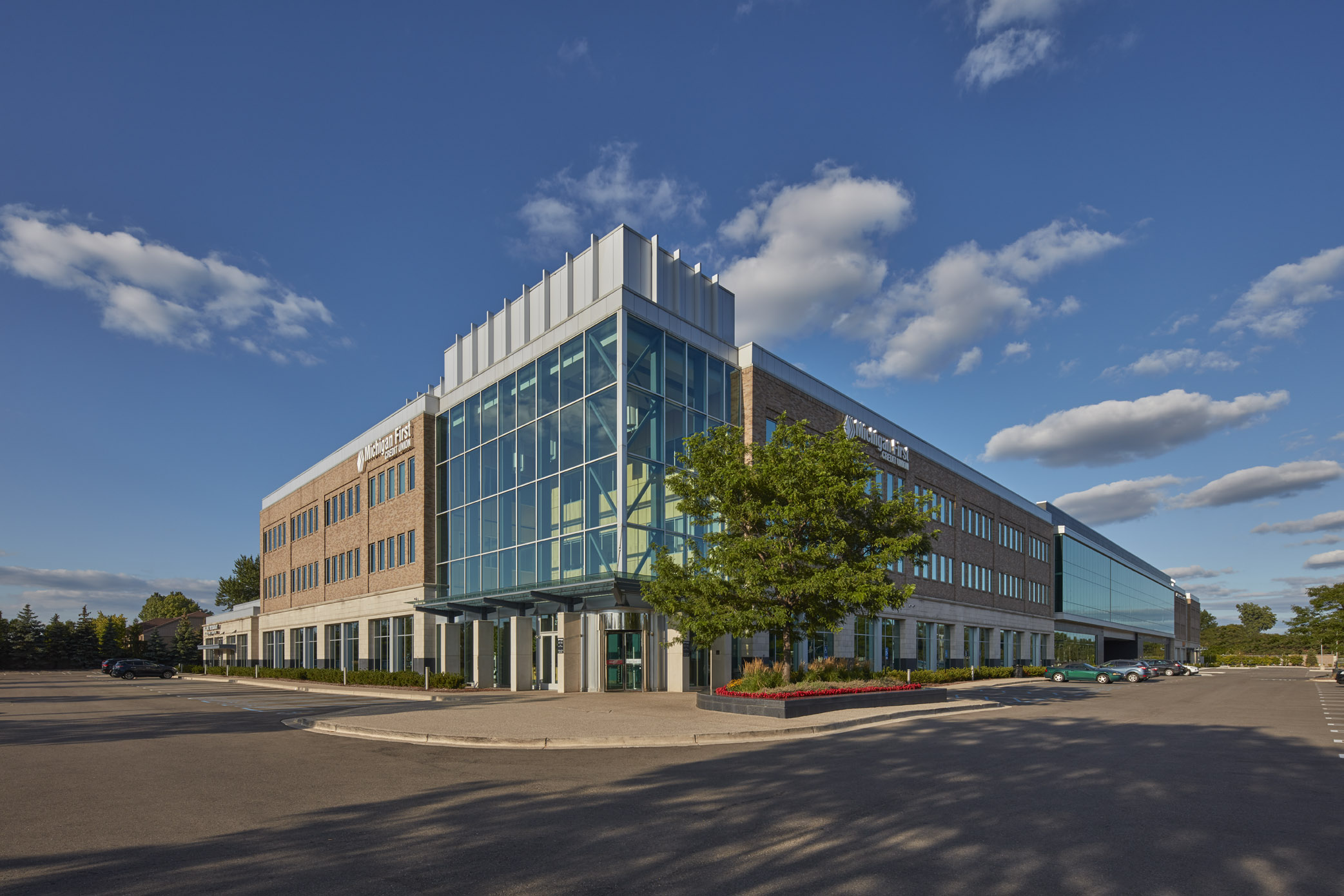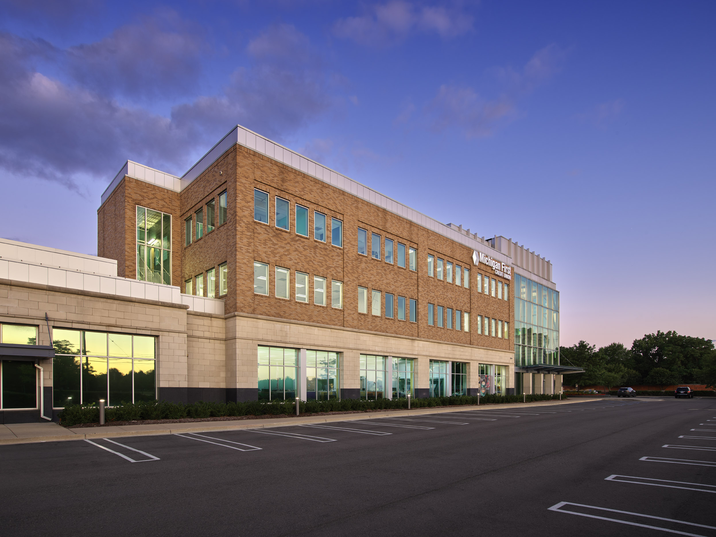 The Michigan First Credit Union Headquarters Expansion successfully bridges a major addition to the original three-story structure located on the corner of Evergreen Road and the I-696 service drive. The traditional materials of granite, stone, brick, and metal reflect the success and stability of this local financial institution and offer a serene sense of order. The arrival experience is enhanced in both the original building and the addition with a two-story, glass lobby atrium. These tall glass towers clearly establish the building’s main entrances. Its openness promotes a welcoming gesture and allows passersby a view of the changing activities inside.