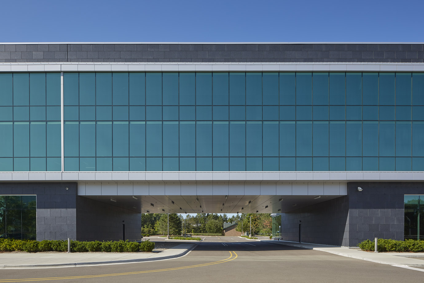 Only ten years later, after experiencing rapid growth and strong success, the Credit Union approached the Architect with the need for a major expansion of its headquarters. Rather than relocating, the Credit Union wanted to leverage its prime location by purchasing adjacent land to the east of the existing headquarters. The three-story addition, at 188,300 square feet, is more than two and a half times the size of the existing building. The glass and stone bridge connector ties into the second and third floors of the original building and is open on the ground floor to accommodate access to the existing, large drive-thru branch facilities located in the rear. The modern bridge compliments the materials of the existing building and is anchored with a new three-story building that follows the same design vernacular of the original headquarters.