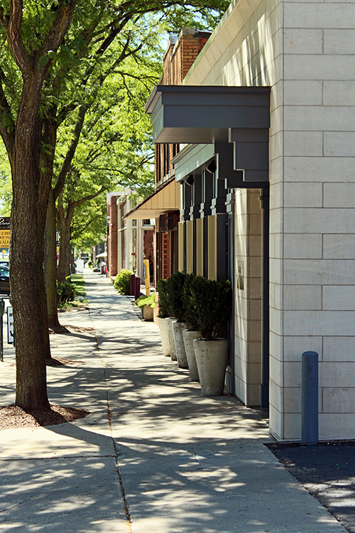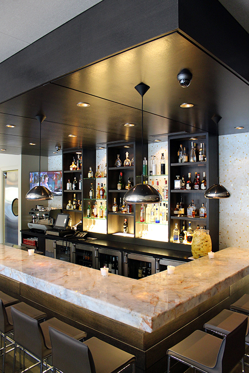 The new interior offers a subtle color palette of charcoal gray and white sand, with accents of dark browns and gold. The colors from the outside migrate to the interiors; notable is the fabric-wrapped ceiling panels, the metal work, and the stone flooring. The bar was completely updated and now features a shimmering gold and white mosaic tile backsplash, with a dropped soffit veneered in walnut wood panels. These colors link the space back to historical Babylon.